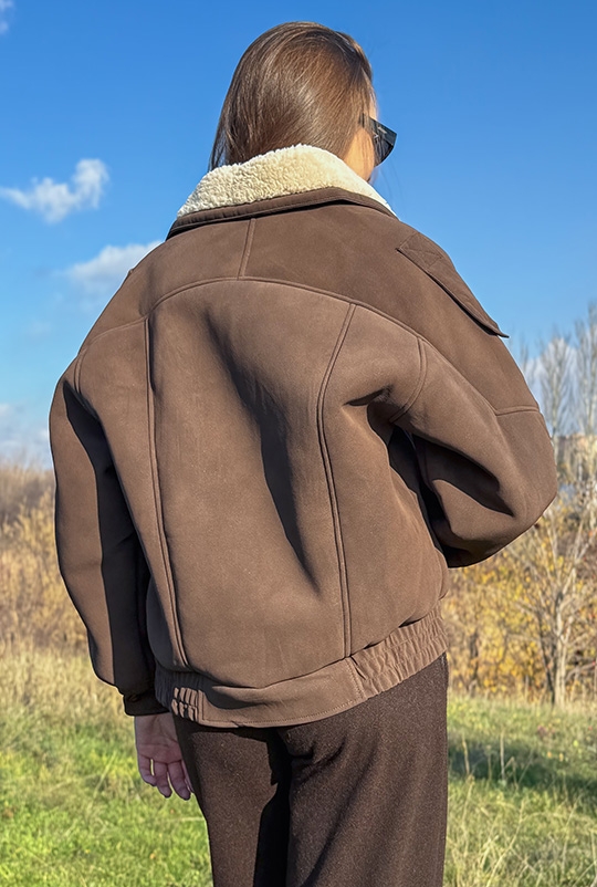 Тепла куртка-бомбер шоколадного кольору, що перетворює звичайний лук на трендовий.