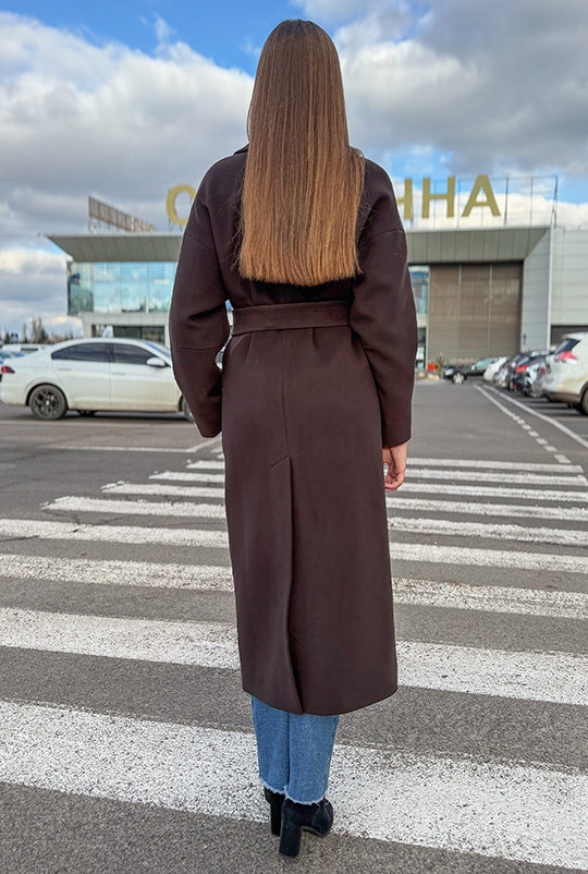 Жіноче пальто максі шоколадного кольору, що виглядає набагато дорожче, ніж коштує насправді.